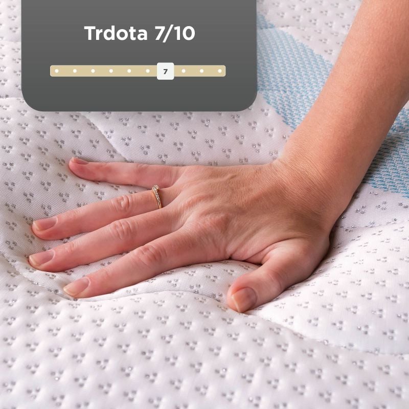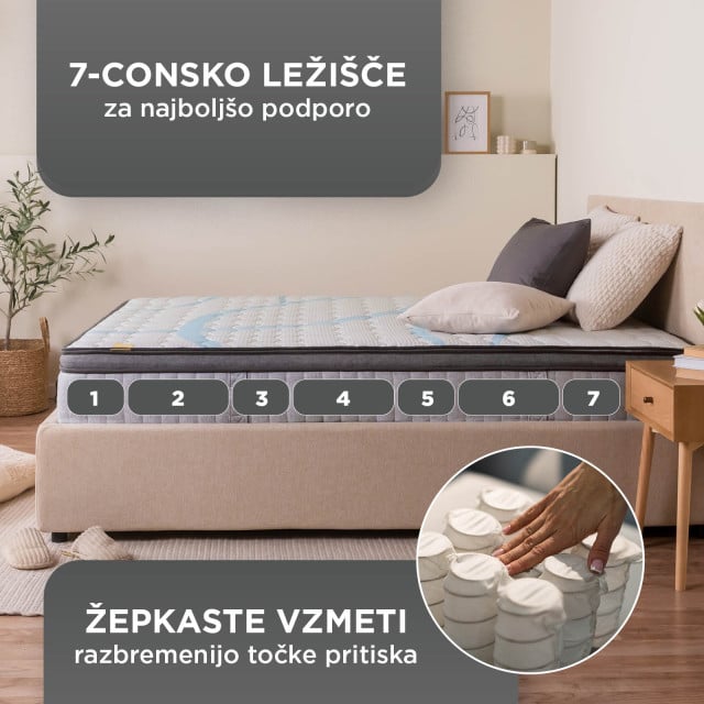 Jedro z vzmetmi je po dolžini razdeljeno na 7 con, ki nudijo različno stopnjo podpore, prilagojene posameznim delom telesa. Čvrstejše cone odlično podpirajo boke in ramena, medtem ko mehkejše cone poskrbijo za udobje na predelu glave in nog. Ta ciljna podpora omogoča pravilen raven položaj hrbtenice, razbremeni točke pritiska in bolje porazdeli težo telesa po celotni dolžini. Zaradi tega se manj obračaš in premetavaš, tvoj spanec pa je bolj globok in sproščujoč.